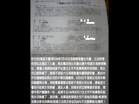 好大的(偽造文書)我104年7月16日並無辦理遷出手續,立法院竟然用私法違反了人權,竟自擅改我女兒遷出國外!我當日是辦理轉址,要遷入我親姊姊家戶址當日太平戶政事務竟回絕我說:我女兒已經除籍了,無視不承認六分局報案遺失護照證明書,跟台中外交處補發給我女兒的中華民國護照,104年8月9日不准我女兒用中華民國護照出境,重點我女還有國民身份證跟健保卡,R O C 承認雙重國籍法規 卻不准我女兒出境,還偽造文書擅自行除籍我女兒的戶籍,違反人權憲法,結果到馬來西亞辦事處求救後,需要中英戶籍騰本一份,今日104年8月11日太平戶政事務所說:我女兒除籍了,超你媽,此舉是軟禁我女兒不准她回馬國=軟禁我沒辦法移民依親!說是賊立法院交待全民60%不用選舉啦!台獨吧!